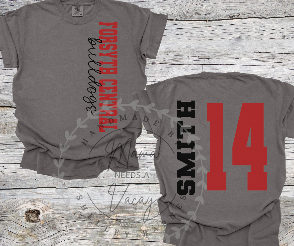 Rep your team in bold style with our Vertical Team Spirit Tee! Featuring a striking vertical team name down the front and the option to customize the back with your name and number, this shirt is a game day essential.